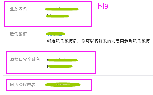 二:需要设置:业务域名,JS接口安全域名,网页授权域名(图9),